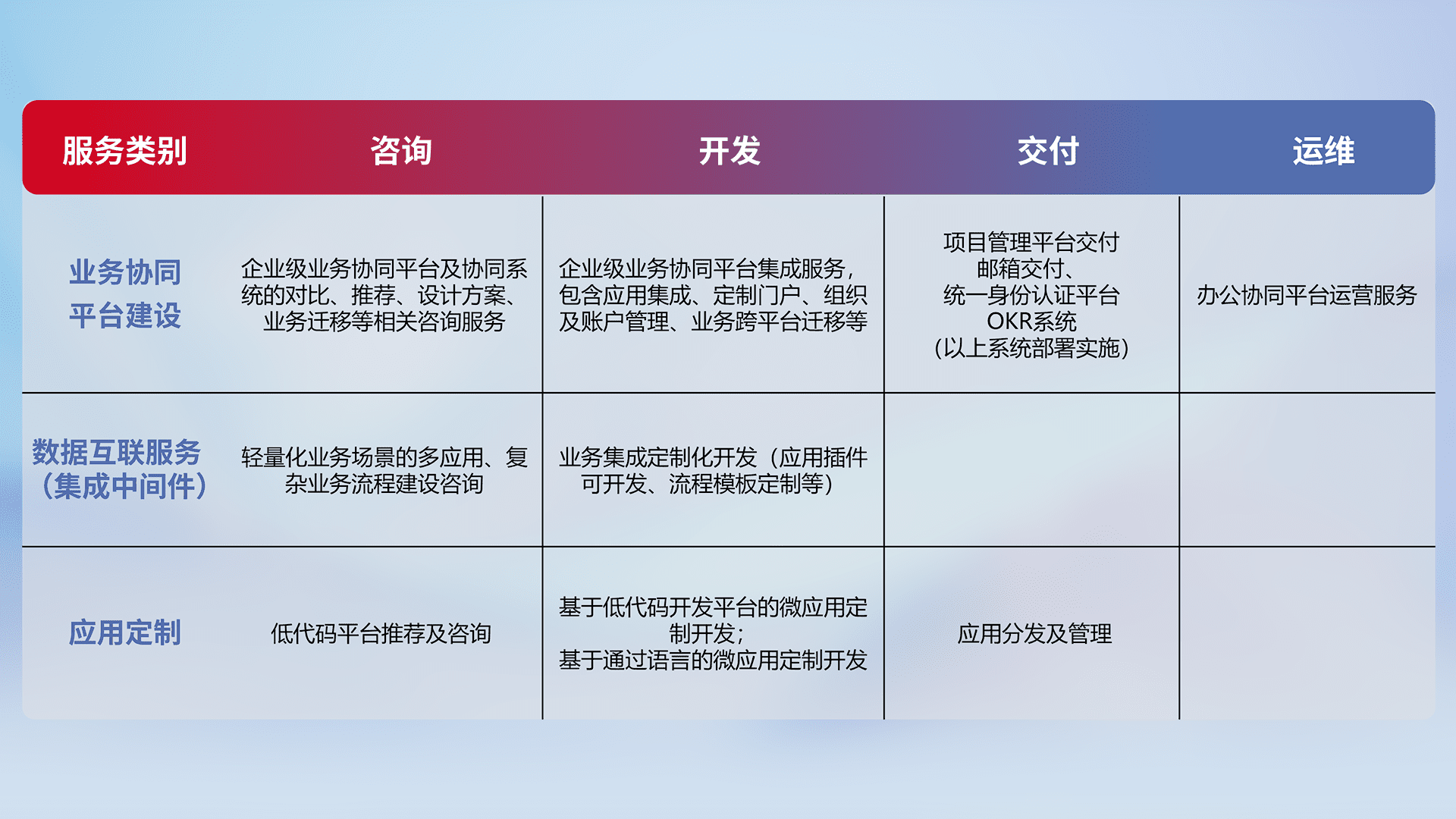 针对钉钉、、企微、、、IDaas等平台级产品提供产品的规划、、、、方案、、、交付、、、定制化开发等服务,,实现如统一协同办公、、、智能客户服务、、、、混合会议管理、、、、智能数据查询、、、、等业务场景,,,,实现数字化转型。。