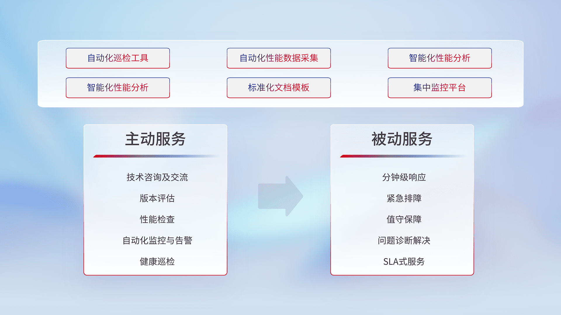 智能化工具和标准化文档,,,,保障服务质量,,,提供主动服务(包含技术咨询、、版本评估、、性能检查、、、、自动化监控与告警、、、健康巡检)和被动服务包含(分钟级响应、、紧急排障、、、值守保障、、问题诊断解决、、、、SLA服务)。。